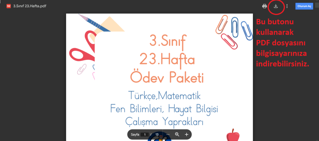 PDF dosyalarını açılan sayfada indirme butonuna tıklayarak bilgisayarınıza indirebilirsiniz.