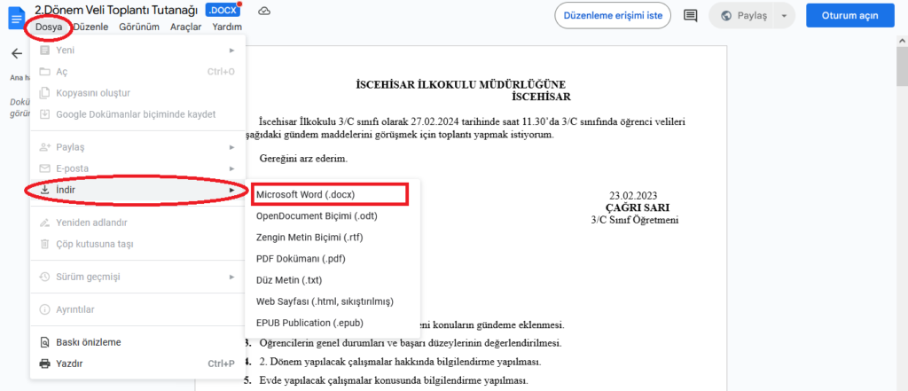 Word, Excel vb. dosyalarda ise sırasıyla Dosya>İndir yolunu takip ederek dosyayı bilgisayarınıza indirebilirsiniz.